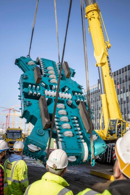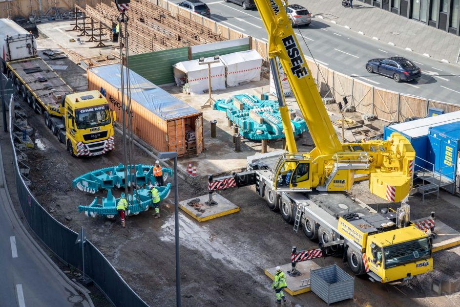 Befestigt an dicken Seilen schwebt das erste Teil der Tunnelvortriebsmaschine (TVM) über die Baustelle auf der Europaallee. Behutsam lenken ein Kran und ein Seilbagger das Subaru-Vista-farbene Schneidradzentrum gemeinsam auf den Ablageort im westlichen Baustellen-Teil. Präzisionsarbeit!