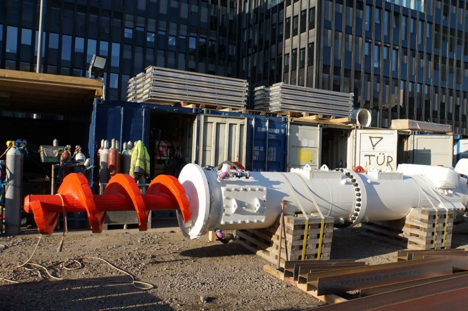 Auf der Baustelle werden die einzelnen Komponenten dann Schritt für Schritt wieder zusammengebaut. Sechs bis zehn Arbeiter/innen sind pro Schicht dafür nötig. Als erstes werden Schneidrad und Schildmantel miteinander verschweißt. Die Nachläufer, der hintere Teil der TVM, werden noch nicht verbunden, sondern auf der Baustelle nur vormontiert und erst in der Startbaugrube final zusammengesetzt. Voraussichtlich im Mai.